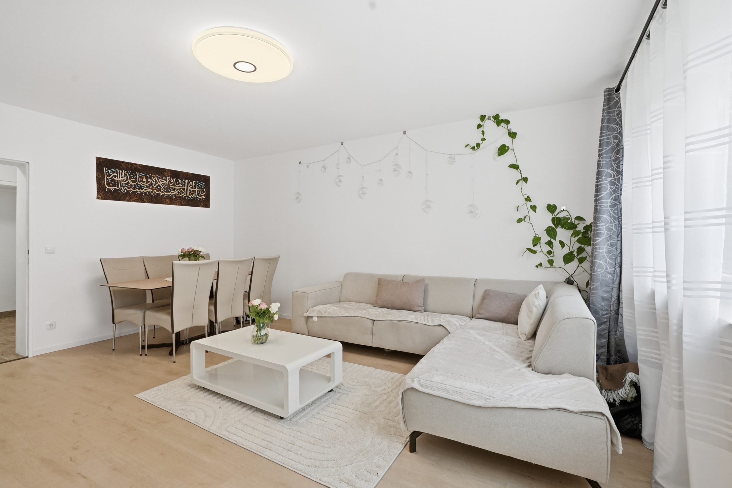 Das Herzstück der Wohnung ist der großzügige Wohnbereich, der viel Platz für Wohnen, Entspannen und geselliges Beisammensein bietet. Große Fensterflächen sorgen für angenehmes Tageslicht und eine freundliche Atmosphäre.